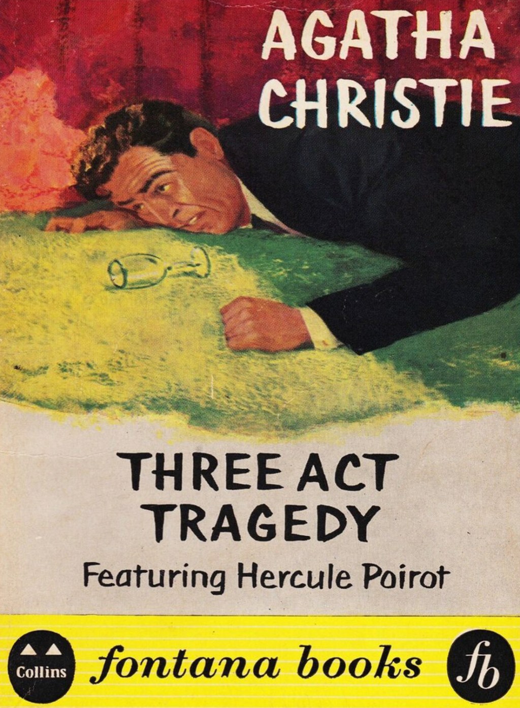På baksidan av mitt exemplar av Tragedi i tre akter står att det är en ”klassisk Agatha Christie – med Hercule Poirot”. Three Act Tragedy kom 1935, och i svensk översättning som Tragedi i tre akter 1937. Ett plötsligt dödsfall under en middagsbjudning avskrivs till en början som oförklarligt, även av Poirot som är en av middagsgästerna. Men när en liknande händelse inträffar vid en annan fest stärks misstankarna att det i själva verket var mord.